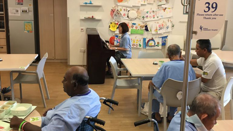 You can play familiar tunes on the piano or other musical instruments for patients during their mealtimes.